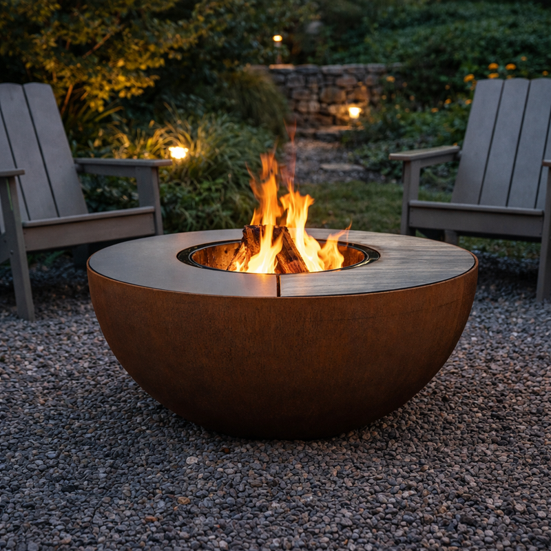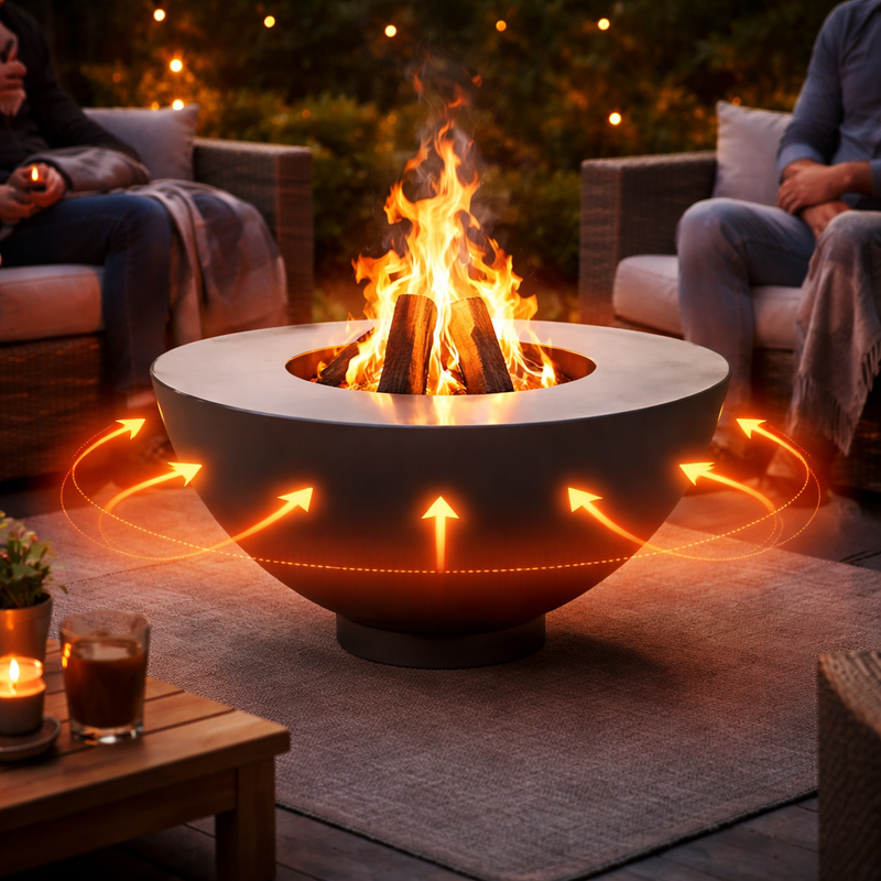 Feuerschalen sind mit einer breiten, offenen Form gestaltet, die es ermöglicht, die Wärme gleichmäßig in der Umgebung zu verteilen. Dadurch sind sie ideal für Zusammenkünfte im Freien, da alle, die um die Schale sitzen, die Wärme genießen können. Die Schalenform hilft außerdem, das Feuer sicher in der Mitte zu bündeln.
