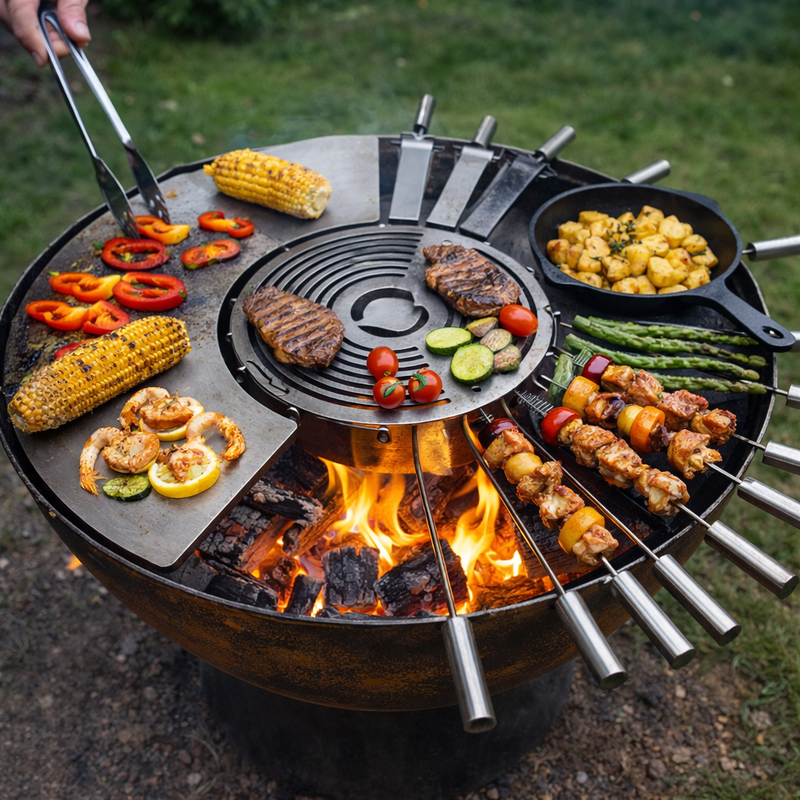 Viele Feuerschalen, wie die gezeigte, sind mit integrierten Kochringen oder Grillplatten ausgestattet. Dadurch können Sie Fleisch grillen, Gemüse rösten oder Snacks direkt über dem Feuer zubereiten. So wird aus einer einfachen Feuerstelle eine vielseitige Outdoor-Kochstation.